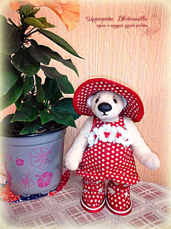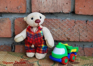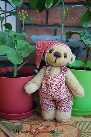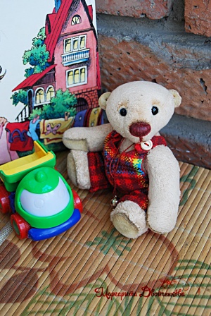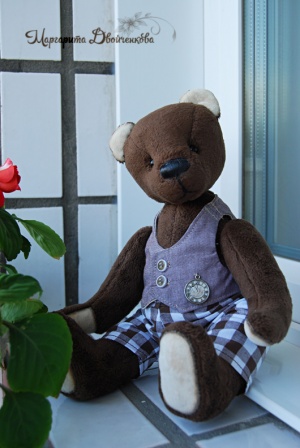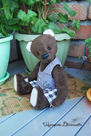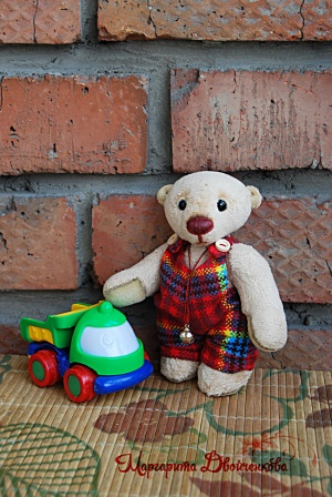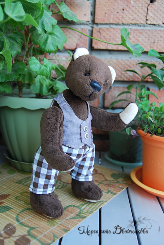 Одет мишаня в штанишки и жилетку (снимаются) из американского хлопка, пошитых непосредственно мной).