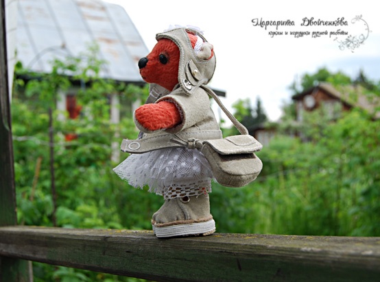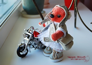 Появилась на свет вот такая яркая, немножко фантазийная, немножко брутальная и в тоже время нежная девочка - мишка Лилу. Выполнена из материала для миниатюры, ладошки и пяточки из миништофа, набита синтепухом и металлическим гранулятом, лапки и голова на шплинтовом креплении, слегка затонирована текстильным маркером. Рост Лилу 16 см. Одета в комплект одежды, состоящий из курточки, шлема, ботиночек (из натуральной замши), платье-сарафан из щёлка с юбочкой из фатина, штанишки из сетки с винтажным кружевом. Сумочка из натуральной замши, повязка на голову, украшенная декоративными цветочками и бусинами. Вся одежда снимается.