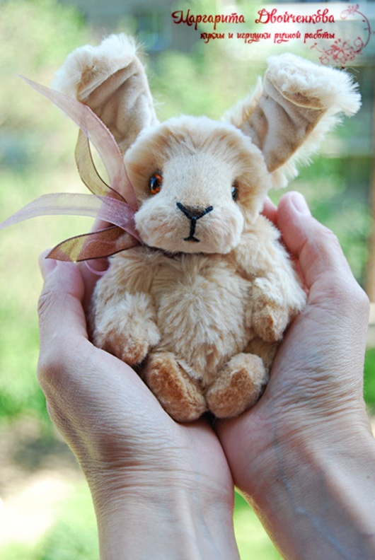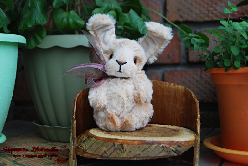 Появился на свет зайка №1!!! И захотел назваться Вафликом...))) Выполнен из искусственного меха (ооочень тактильного), "внутренние" ушки из миништофа, набит синтепухом и металлическим гранулятом, крепление лапок и головы шплинтовое (как и положено у всех уважающих себя теддиков))), ушки армированные (гнутся), затонирован художественным маслом и текстильным маркером, мордочка оформлена с помощью стрижки и фильцевания. Рост заи 13 см. без ушей (с ушами 17 см.).