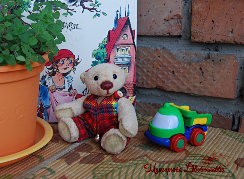 Мишка Баклажанчик решился поменять образ (постоянно ходить в одном костюмчике надоедает - хочется перемен))) Теперь он одет в комплект одежды из винтажного хлопка (производство СССР)), ботиночки из натуральной замши. Мишка научился стоять самостоятельно! Подробное описание материалов, из которых пошит миха, смотрите в предыдущем сообщении.