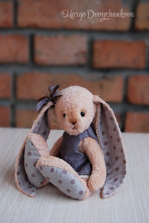 Сшита из мягкого и нежного меха...Зайка №3))) Адель... ростиком 23 см., пошита из вискозы, пяточки и внутреннее ушко из американского хлопка, набита опилочками, утяжелёна металлическим гранулятом, крепления подвижные (6 шплинтов). Небольшая тонировка художественным маслом. Одета в сарафанчик (снимается).