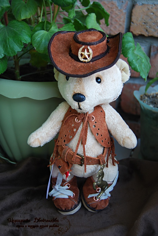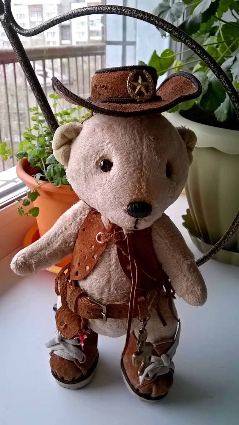 Мишка Тедди Джонни выполнен из искусственного меха, пяточки из миништофа, набит синтепухом и металлическим гранулятом, Затонирован маслом. Жилетка, ботиночки, шляпа и ремень из натуральной кожи. Рост 22 см., в шляпе - 25 см.)))