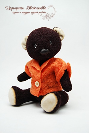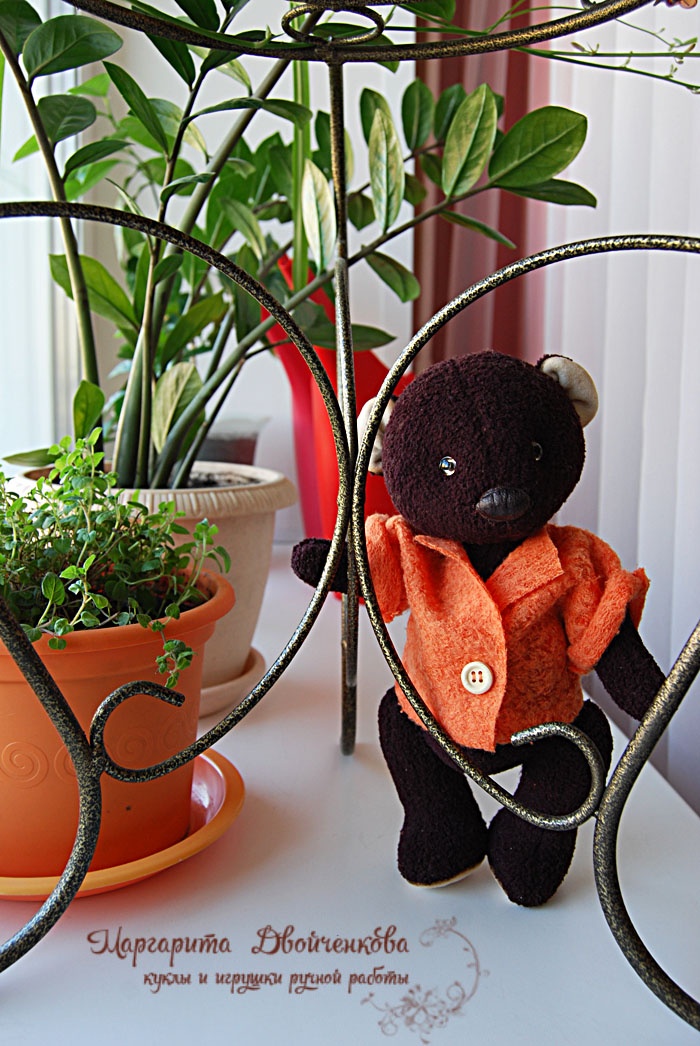 Выполнен из флиса баклажанового цвета, пяточки из миништофа, набивка синтепух и металлический гранулят, слегка затонирован маслом и текстильным маркером, лапки и голова на шплинтах. Одет в курточку-пиджачок из легкого фетра (снимается). Рост мишки 24 см.