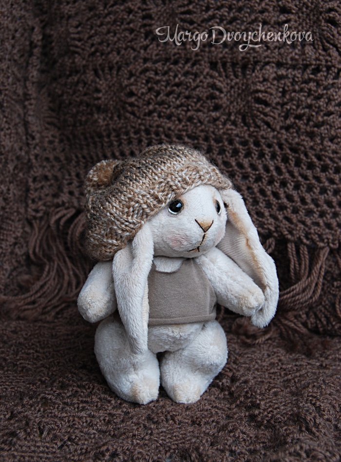 Одета зая в "хипповскую" маечку и вязанный беретик с помпоном.