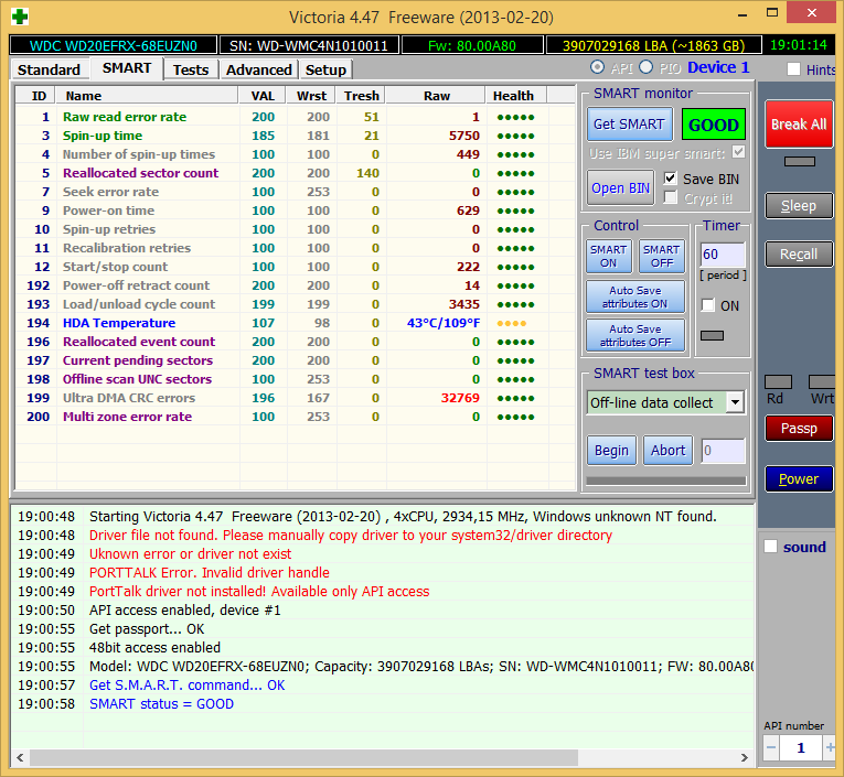 Сам жесткий, по всей вероятности, исправен и здоров. Обратите внимание на 199 атрибут (UDMA CRC ERRORS). Такое высокое значение говорит что в процессе передачи данных винт- матплата возникает много ошибок. Для начала следует заменить SATA кабелек, попробовать подключить к другому порту.