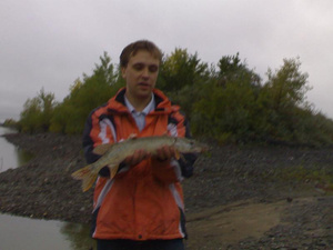 Первая щука моя (первый в жизни раз закинул блесну 30-го августа на уени в скале - вытащил трёх щучат - спец по ловле сказал - новичкам везёт. Был прав)