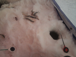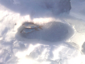 Подходил я часов после 15, на льду оставалось трое. Ждали вечернего клева. Наибольший улов - несколько экземплярчиков. Один с двумя рыбешками, у второго тоже, при мне поймал третьего чебачка. Улов такой: