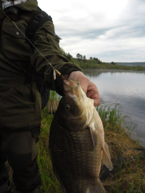 Целенаправленно не занимался ловлей карася на блесенки, но периодически, весной и в начале лета, для спиннингистов бывают сюрпризы, когда пытаются уговорить окунька или щурогайку на мелкие вертушки, а ловится карасик.