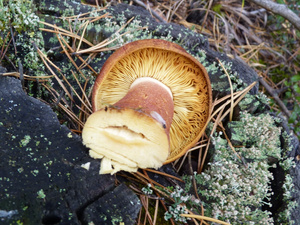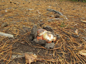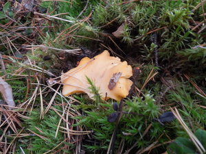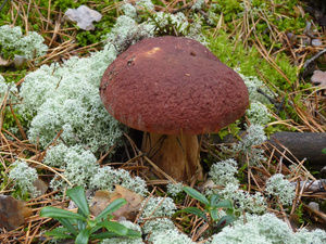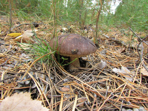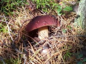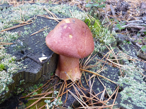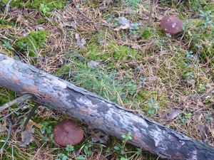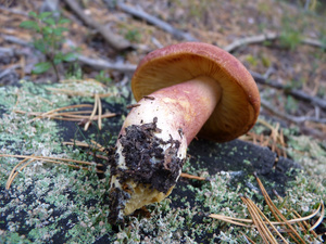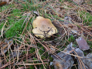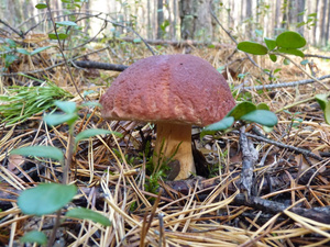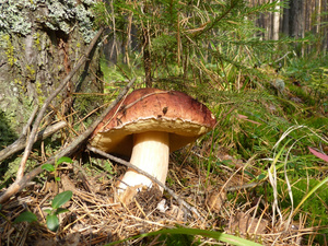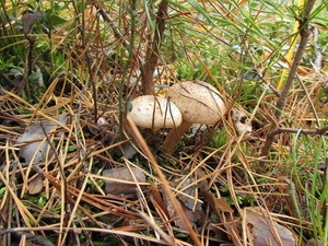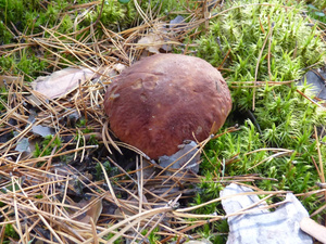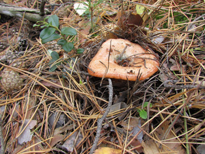 Людей практически не видел, только пара-тройка машин проезжала мимо. Поел немножко вкусной брусники и черники. Грибов не сказать, что много, в основном попадались поганки (чаще) и боровики (реже). Белых за три часа нашел два с половиной десятка - в основном крепких, среднего размера, почти без переростков, плюс пару совсем маленьких. И три моховика. Как говорится, скромненько, но со вкусом: на выходных в рационе преобладало грибное меню.:)И - тоже давно хотел спросить про один гриб, но все забывал его сфотографировать. Кто-нибудь подскажет, что это за лесной житель (рос он не на пне, а просто неподалеку)? Встречал такие у нас в разных борах.