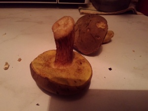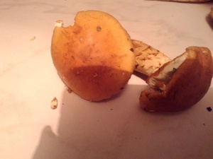 Когда мыла грибы, показалось странным, что у неск грибов, при срезе ножки, в места небольших повреждений (типа червоточин странных) мякоть ножки желтела... Когда уже сварила все грибы вместе, вспомнила о таком грибе, как горчак... Полезла смотреть в инете и - что то теперь вся в сомнениях - стоит ли жарить, то, что отварила))