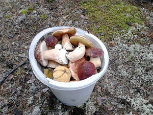 Мой улов в воскресенье - 15-ти литровое ведро маслят (очень много мелких) и немного рыжиков. Собрано не более, чем за час. Место малодоступное - остров на Оби.