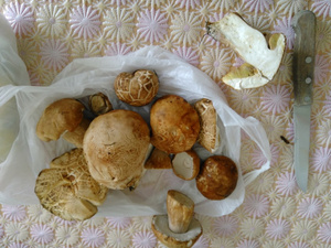 немного лисичек, старые подберезовики, умершие валом маслята и адын белый, причем такое ощущение что он помнит еще Моисея (оставила запоминать историю и дальше).на сколько я знаю, их так продают чтобы не было видно червивый гриб или нет