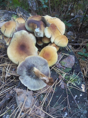 В сосновом лесу набрели на пенечки с ложными опятами..Это ложноопенок серопластинчатый - есть его можно, но, наверное, толку мало:))) Мне кажется он не вкусный, я не пробовал:) Гриб 4 категории. "