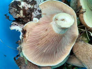 Сегодня плюнул на все и поехал на разведку. Всего помаленьку - белых штук 10-12, подберезовики, штук 8 подосиновиков, одна малюсенькая лисичка и 2 груздя. Грузди странноватые - срозова, но пахнет груздем. Может подтопольники (я их не знаю)?