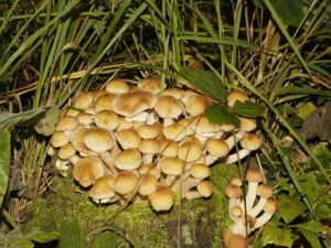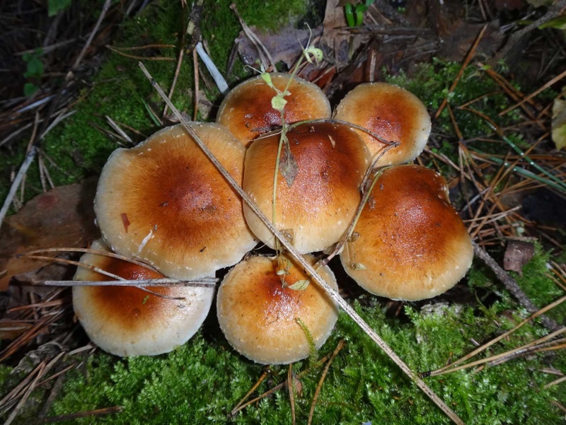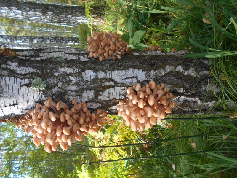 Сегодня попались вот такие грибы, наряду с обычными осенними опятами. Это опята или нет? Росли возле трухлявой березы, кучками, довольно много (в лесу попались только в двух местах). Пахнут опятами, но смутила яркая окраска и отсутствие "юбочки". Брать не стала, т.к. и обычных полно, но все же любопытно - такой окраски опят еще не встречала.