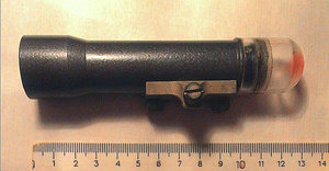 Несерийный прицел произведён на оптическом заводе им. Ленина. Удобный большой объектив прицела, лёгкое титановое крепление, подсветка пятна.