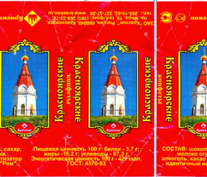 Конфеты "Красноярские", фабрика Краскон, Красноярск. С изображением часовни Параскевы Пятницы (той самой, что на 10-рублевой купюре).