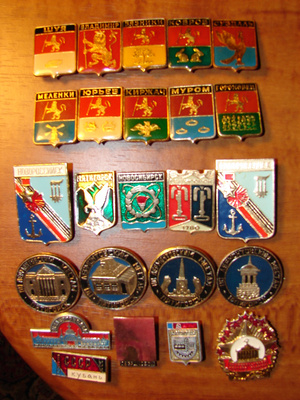 а нету сейчас значков, в городе найти значки с меной символикой или там с гербом очень трудно (вот в новосибирске с год как 3 штуки появились). Вот смотрю на то что у меня на стенке висят значки , за год появляется не больше 10 новых (учитывая что я довольно много езжу по командировкам по Сибири и Дальнему востоку)