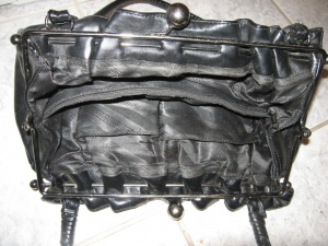 Цвет черный. Застежка - два металлических шарика. Внутри несколько отделений и карманов, в том числе на молниях. Ручки не потертые, в отличном состоянии.