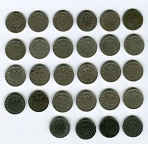 Еще набор 10 пфеннигов насобирал с 1874 по 1922 - 36 монет, года не повторяются