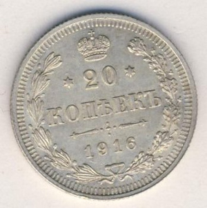 Есть одна монета 20 копеек 1916 года (Николай II). Подскажите сколько будет стоить?Если вторая сторона такая же как и показанная, то рублей 100-200 потянет (это не ставка). Для оценки нужно обе стороны видеть. А еще и гурт не помешает... Приложите, если не сложно, фото второй стороны.