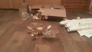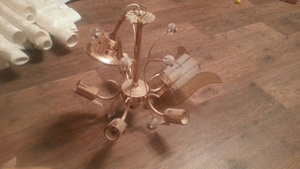 1) Люстра 5-рожковая с крючковым подвесом. Одна стекляшка развалилась на 2 части, подклеили скотчем (не эстетично, но все же) - на бутылку вина.