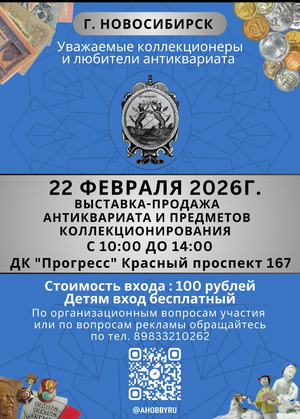 22 февраля 2026г. (Воскресенье) в г. Новосибирск, по адресу Красный проспект 167, ДК Прогресс, с 10 до 14 будет проходить ВЫСТАВКА-ЯРМАРКА предметов коллекционирования, винтажа и антиквариата.