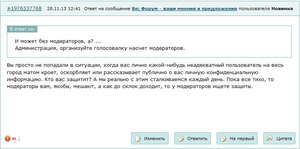 И может без модераторов, а? ...Вы просто не попадали в ситуации, когда вас лично какой-нибудь неадекватный пользователь на весь город матом кроет, оскорбляет или рассказывает публично о вас личную конфиденциальную информацию. Кто вас защитит? А мы реально с этим сталкиваемся каждый день. Пока все тихо, то модераторы вам, якобы, мешают, а как до склок доходит, то у модераторов ищете защиты.