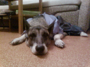 Спасибо Вам огромное за ободряющие слова! Надеюсь, ваше чудо быстренько поправится и будет вас еще 100 лет радовать!!! Хотела вот еще спросить, эти выделения просто белые или могут быть с кровью, потому что сегодня, например, крови немножко было... и вообще никак нельзя обойтись без вырезания матки, я просто боюсь, что не переживет она еще одной операции... ей всё-таки уже 13, а для овчарки возраст преклонный. Кстати, после операции кололи ей Ронколейкин, это хорошее лекарство? Разбавлю грустную тему фотографией, там одежка, в которую мы одевали псинку, когда швы у нее разошлись, весь двор хохотал!