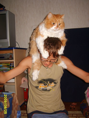Сел на шею! Морда рыжая!Чудовищных размеров кот!
