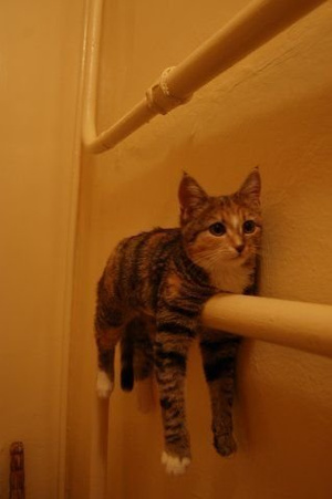 Как птичка на насесте - всеми лапками на бортике, и морда такая брезглииивая