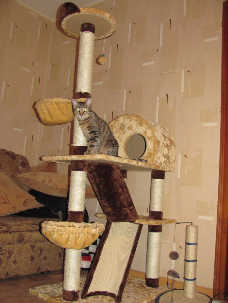 Счастливые будни Рыси (Эльки) - ей купили домик высотой почти 2 метра и теперь она с него не слезаетНичего себе какой домина! Какие то там дырочки, куда она лапки суёт (они как-то закрываются, когда лапка выходит что ли, интересно)... и целых 2 разноуровневых гамачка, круто, молодцы хозяева! Достойно огранизовали жизнь кошечки.