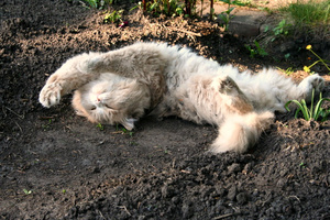 Наши коты черно-белые валяются, но читсые всегда. Огонек вообще не валяется никогда - интеллигент однако! Мы его как подобрали в том году, так и не мыли ни разу - не давался. Рот как откроет, а там клыки по 2 см - 2 спичечных коробка пройдут!