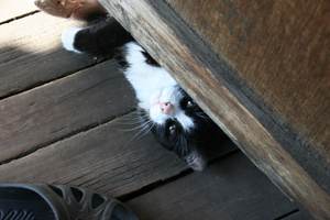 В таком случае начну с единственной кошки, с которой все началось. Дело было опять на даче. Однажды поздно ночью жена на втором этаже смотрит телевизор и слышит, как кто-то бьется в дверь веранды - испугалась, подумала, что опять воры лезут (был период - лезли в наглую, хотя дачка обычная полугнилая, но смотрится из-за полностью накрытой плотным слоем хмеля). Взяла прут, заранее приготовленный и отодвинув занавеску. выглянула - никого! Легла, но через некоторое время опять удар в дверь веранды. Снова выглянула- опять никого. Тогда открыла дверь, а ей муррр ! Так и назвала она ее - Мурка. Маленькая, черно-белая кошечка весом около 1кг! Пустила в комнату. Кошка легла на стул и тут же заснула. Утром ушла. Вечером опять пришла. Жена покормила ее и кошка опять на стул. Так и осталась у нас. Как потом выяснилось, наш сосед по даче, бывший физик, а потом алкоголик, держал кошку молодую в подвале (как потом сказала его несчастная мать), иногда кидал туда хлеб. Это объясняло, почему кошка предпочитала мясо хлебу (потом исправилась).