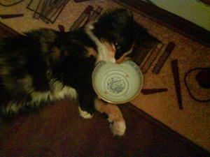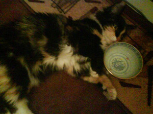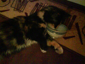 Сорри за плохие снимки, за фотиком надо лезть, а сотовый всегда под рукой лежит. Спала возле чашки с водой, потом вроде как попить опустила голову, потом глаза закрыла и спит себе дальше....прямо в чашке