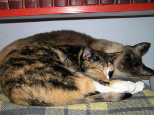 Моя черепашка Кэти всегда ложится под бочок к коту Маркизу - видно по цвету выбирает из котов с кем спать