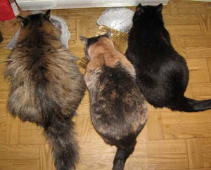 Вот когда я жила отдельно и у меня их двое было, тогда - да, я тоже сидела и не давала съесть лишнее, за двумя уследить получалось, а сейчас их трое+подобранец, вот вообще не реально! Один спит, другая жрет, третья скачет. Их есть одновременно не заставишь никак, потому что Боня видете ли не будет есть если рядом Мила или подобранец, у Милы вообще какой-то странный распорядок поедания еды, ну а Лис "пока вы девки тут думаете, я пожалуй покушаю".
