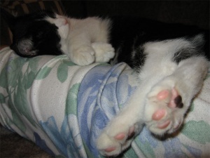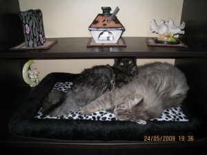 По разному.. Но утром я просыпаюсь от того, что эти две тушки пытаются улечься на мне... И поближе к лицу...