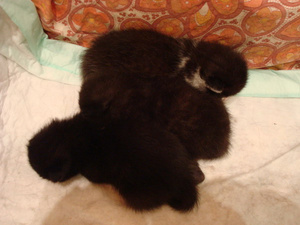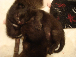Карапузы умильные, все толстики, глазки открылись, спят в обнимочку да Рыську сосут. Вы бы видели, как нежно Черри их облизывае, а онина нее шипеть пытаются, но не умеют пока и только ротики разевают)))