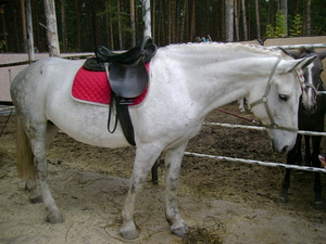 Даша очень красивая и спокойная. Она орловский рысак(порода) Вообще замечательная лошадь)