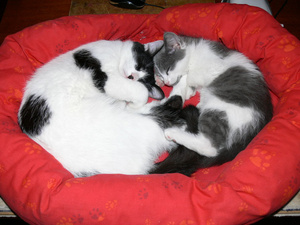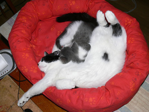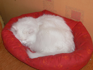 Когда есть кто на передержках - немного больше. Все наши любимчики)))а вот и мой Мусь в красной лежанке, один, соседий не любитШикарно смотрится- ослепительно белое, на огненно-красном!![]()