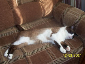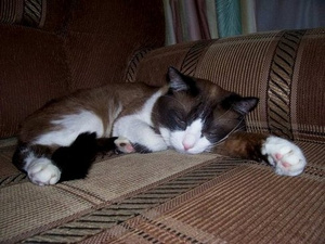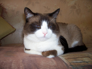 Красивый!Да,когда мы его брали,думали беспородный,а потом книжку про кошек купили,стали листать,и... нашли-котейку с мордочкой почти как у нашего)Он у вас похож на породу сноу-шу окрасом.