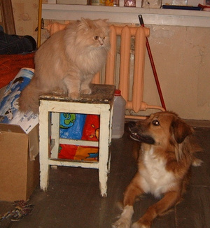 В субботу с щеном-подобрашкой к родителям заезжала, младшие кошаки попрятались, а Лиска вышла встречать щенулю. Посмотрела на него серьезно, потом мама щена по комнатам повела - папе показать, Алиса проследила, за щеном по пятам ходила.