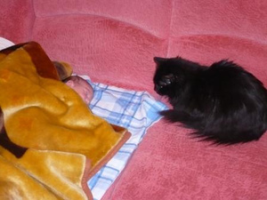 Кстати, забыла, могут спокойно лежать только ночью, по разные стороны дивана... вот не пойму, толи они не видят друг друга, а запах видимо их уже смешался