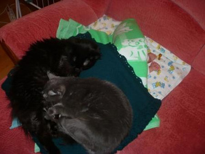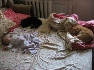 Правильно- когда один не справляется, надо пригласить подругу. Когда 8 килограмм кошек заваливаются на ноги ребенка, он спит беспробудно от кормежки до кормежки. Мне нравится.