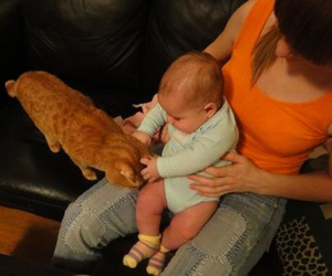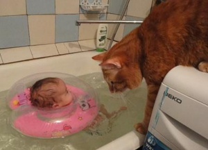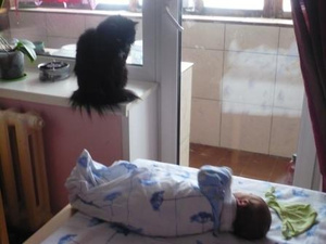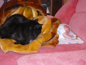 Когда мой сынулька родился, у нас были две кошки. Причем не так давно у них отняли котят. Так что особых проблем не было - наоборот, они мне помогали! Стоит сынуле только скривиться, как бегут вперед меня и сразу хрюкают. Правда, в кроватку не лезли, через прутья похрюкивали. От малыша стали шарахаться, когда ходить начал. Ну просто сыночка кошек ведь за хвостик и за лапочки во все стороны стал тянуть.