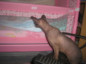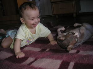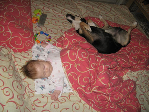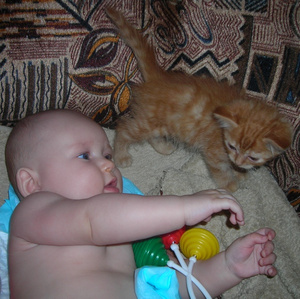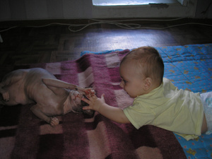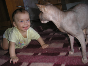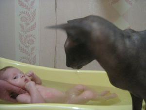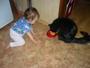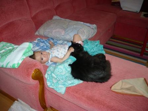 Фоток со звериками у меня пока нет, но у меня как в анекдоте - как я ложу Аню в кроватку: Беру Аню с дивана, ложу ее обратно, выгоняю кота из кроватки, беру Аню с дивана, ложу ее обратно, выгоняю кота из кроватки и тд