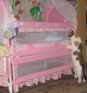 Третий вечер повторяется одна и та же ситуация: укладываем дочу спать, и Финик начинает прыгать к ней в кроватку, но как только мы подрываемся выгонять его оттуда и наказывать - выпрыгивает и ложится на пол. Создается впечатление, что это он так с нами играет. Потому что муж говорит, что ночью, когда мы оба спим - кот в кроватку не прыгает.