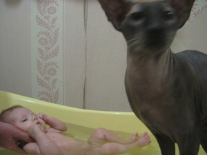 А если не пускать кота в комнату на ночь - есть такая возможность? Не будет мявкать под дверью? Как вариант, пока доченька не подрастет немного. Потом - то она сама кота будет в кровать тащить, а он убегать)))) Точно знаю, 16-летний сын до сих пор так делает! У меня три котея, доверяю ляльку только одному их них, знаю, что не обидит. Поэтому в спальню только его пускаю на ночь, остальных выдворяю.