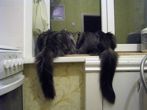 Когда дрыхнут-батонятся и хвостами друг друга прикроют - это нечто: черный хвост на белом облаке и белоснежный веник на чёрном фонеВ сплюшках есть такие фотки? Посмотреть охота. Пойду поищу...![]()